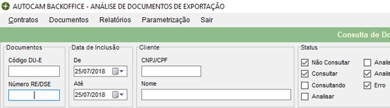 O módulo Analise de Documentos de Exportação possibilita trabalhar os Documentos de Exportação DSE (Declaração Simplificada de Exportação), RE (Registro de Exportação) e DU-E (Declaração Unificada de Exportação).