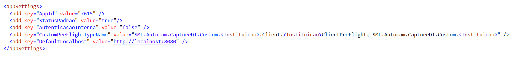 Após a instalação é necessário parametrizar o arquivo SML.Autocam.CaptureDI.Client.exe.config localizado na raiz da instalação do client, neste arquivo na tag configuration/appSettings existem os seguintes parâmetros: