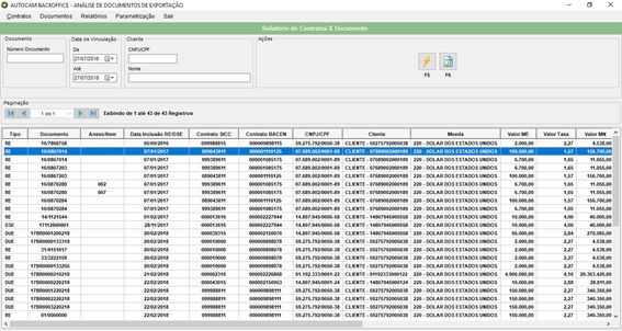A opção Consultar Contratos X Documentos do menu Relatórios possibilita ao usuário de Câmbio realizar uma consulta de Documentos relacionando-os aos Contratos vinculados possibilitando análise de valores, vínculos dentre outros.