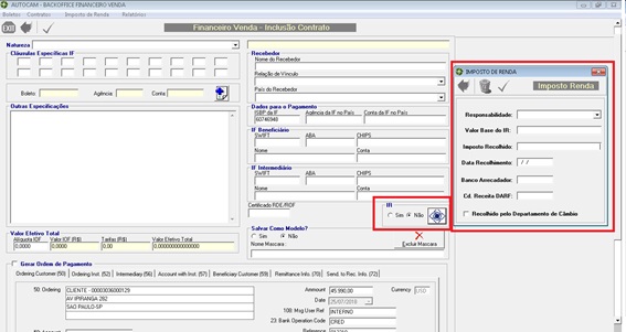 Durante preenchimento do Complemento da Edição de Contrato, é possível incluir dados para Imposto de Renda clicando no respectivo botão e preenchendo os dados na tela que abre conforme figura abaixo:
