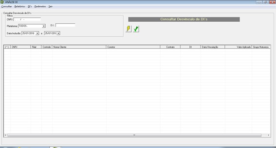 A opção Desvincular DI possibilita realizar consulta de DIs e seleção da DI desejada para realizar processo de Desvinculo com Contrato de Câmbio. Após consulta com base nos filtros informados pelo usuário, é possível selecionar a DI desejada e clicar no botão Reanalisar. Segue abaixo a respectiva tela: