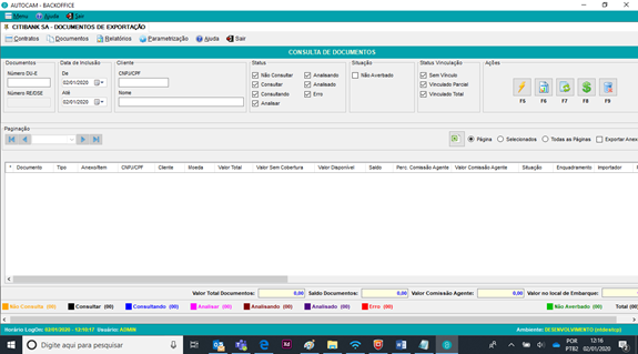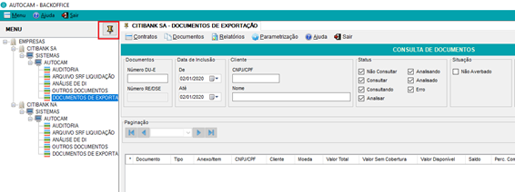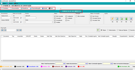 O sistema inicia na tela de consulta de documentos, mas nós vamos mostrar o passo-a-passo, iniciando pelas opções de menu destacadas na tela abaixo