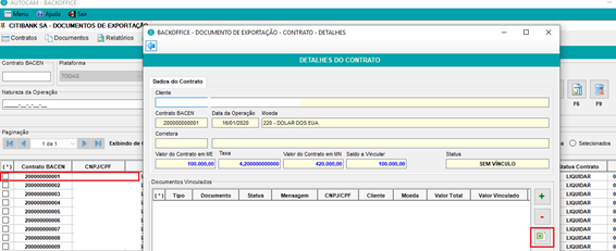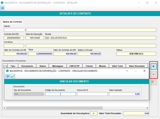 Na tela de Detalhes do Contrato, o usuário poderá vincular e desvincular o contrato a uma DU-E, utilizando os botões destacados abaixo. O usuário deve informar o número da DUE e o valor a ser aplicado