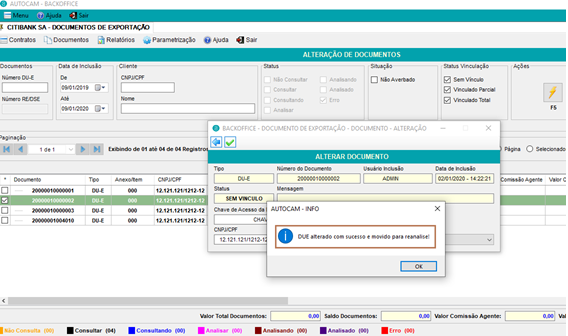 O sistema avisa que o documento deve ser reanalisado, após ter sido alterado