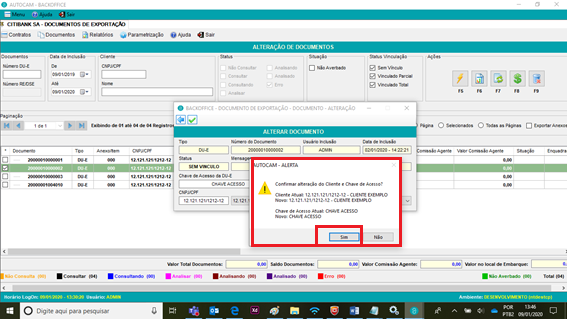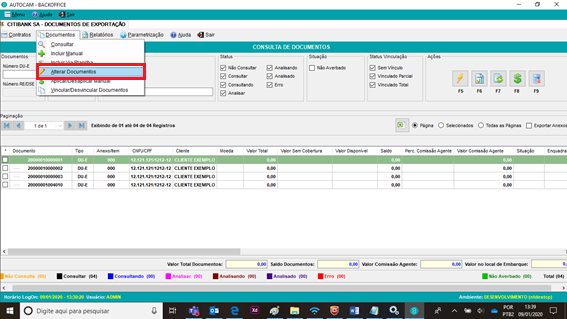 Alterar Documentos de Exportação: O usuário deve abrir o menu Documentos e clicar em Alterar Documentos