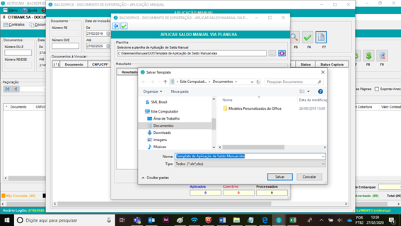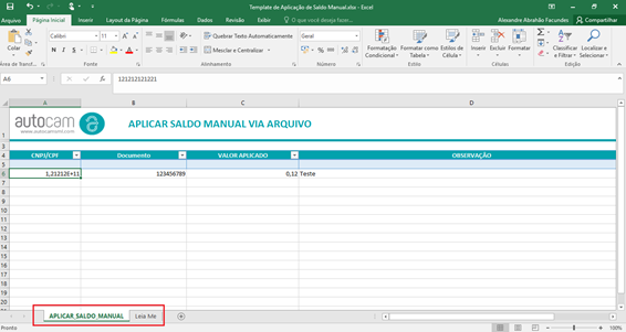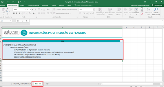 O usuário pode gerar um Template da planilha, Template de Aplicação de Saldo Manual.xlsx
