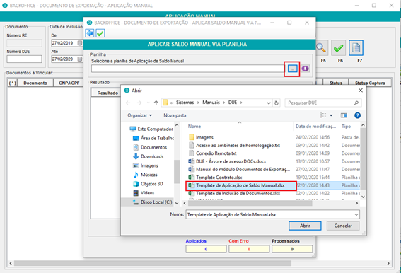 Ao clicarmos no botão (F7) o sistema permite que o usuário carregue uma planilha com os dados a serem aplicados