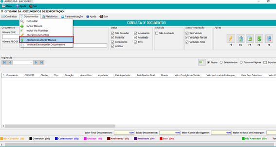 Acesso à função: Clicar em Documentos / Aplicar Desaplicar Manual