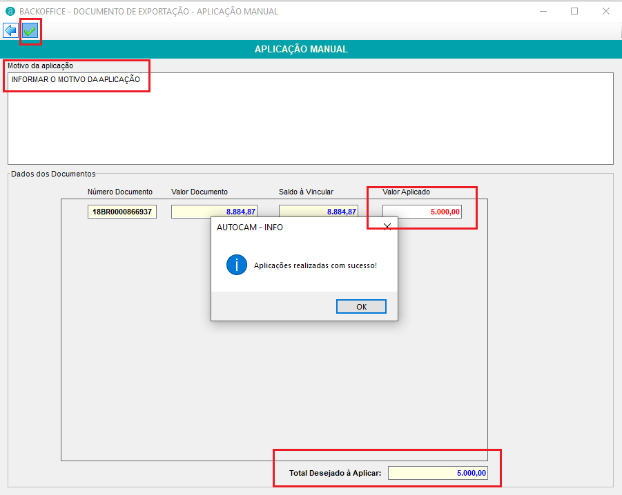 O usuário deve informar o motivo da aplicação manual, o valor a ser aplicado e clicar no botão Confirmar Aplicação