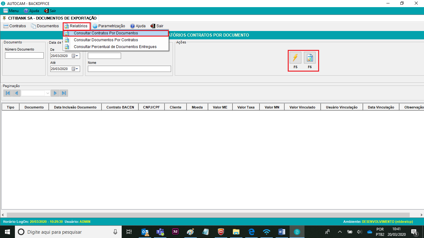 Deve-se acessar o menu Relatórios - Consultar Contratos por Documento, optar pelos filtros disponíveis e fazer a pesquisa, apertando o botão F5, após a pesquisa, deve-se apertar o botão F6 Exportar Relatório