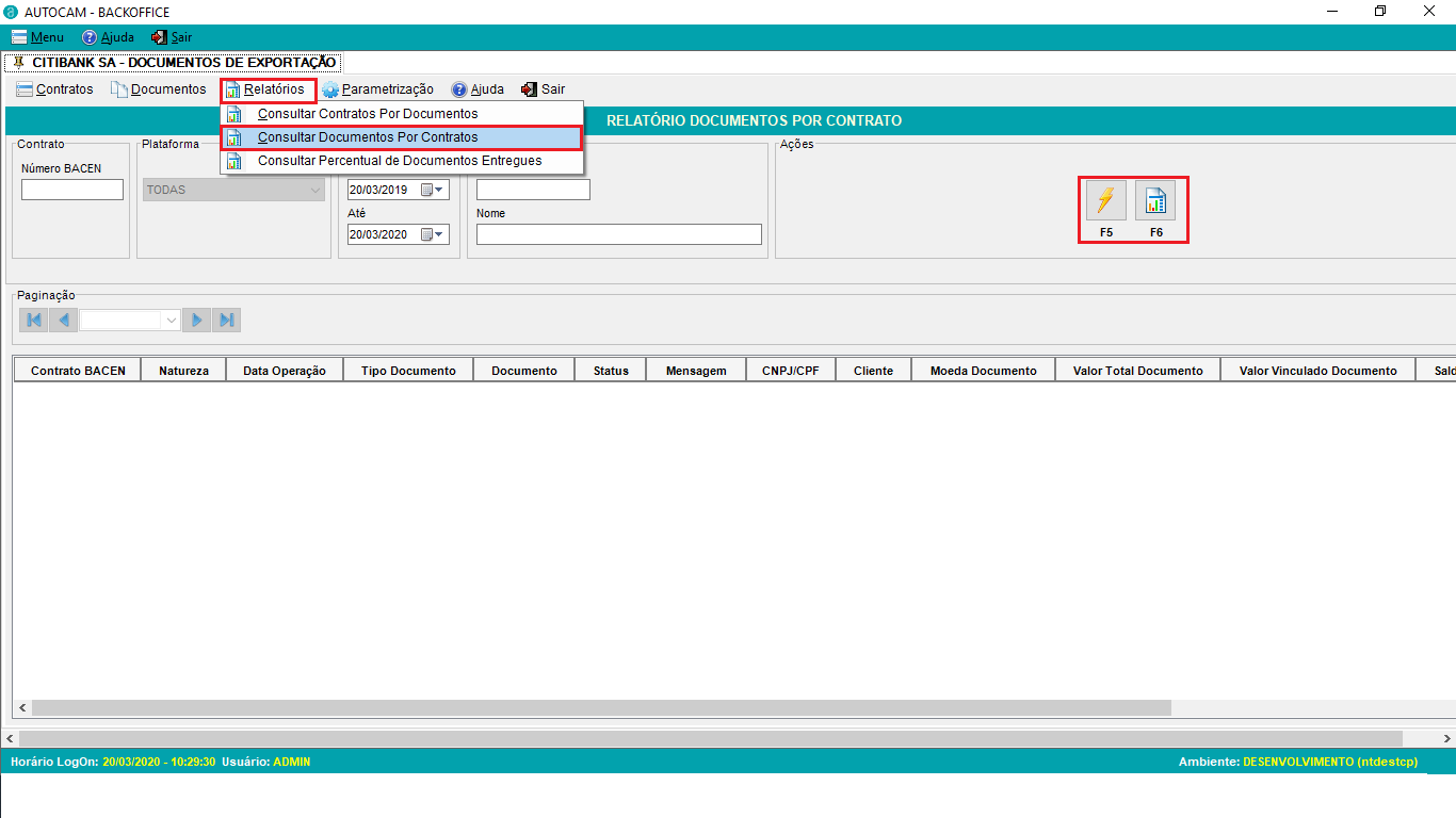 Deve-se acessar o menu Relatórios - Consultar Documentos por Contratos, optar pelos filtros disponíveis e fazer a pesquisa, apertando o botão F5, após a pesquisa, deve-se apertar o botão F6 Exportar Relatório