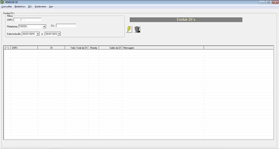 A opção Excluir DI possibilita consultar e selecionar uma determinada DI para realizar exclusão. Ao selecionar a DI desejada, para excluir basta clicar no botão Excluir DIs Selecionadas. Segue abaixo respectiva tela: