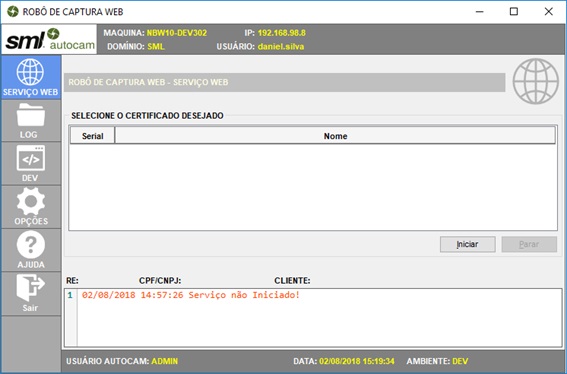 Possibilita ao usuário de Câmbio realizar os procedimentos de Consulta de REs no WebService do Siscomex. Ao clicar neste Botão, abre a tela que possibilita selecionar Certificado Digital válido e clicar no Botão Iniciar para processar consultas ao WebService do Siscomex.