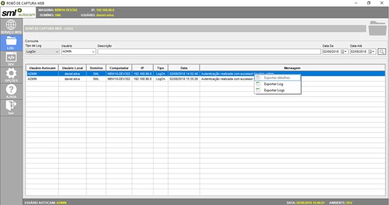 Também é possível selecionar um Log do Grid com o Botão direito do Mouse para Exportar o Log ou selecionar no menu suspenso a opção Exportar Logs para extrair todas as linhas do Grid.