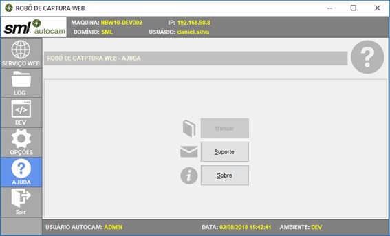 O Robô possui as seguintes funcionalidades passiveis de serem selecionadas por meio dos botões de Menu Lateral Esquerdo em sua interface: