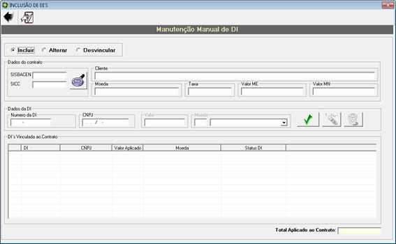 - Incluir: Inclui nova DI e vincula ao contrato referenciado/consultado