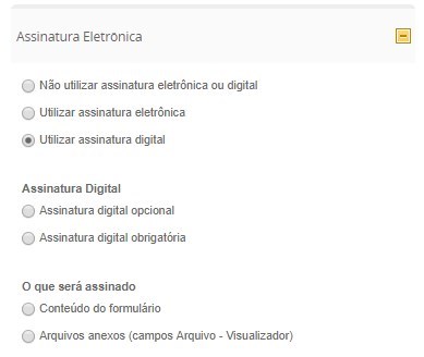 - Conteúdo do formulário: selecione essa opção caso deseje assinar o conteúdo preenchido nos campos do processo;