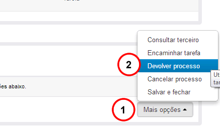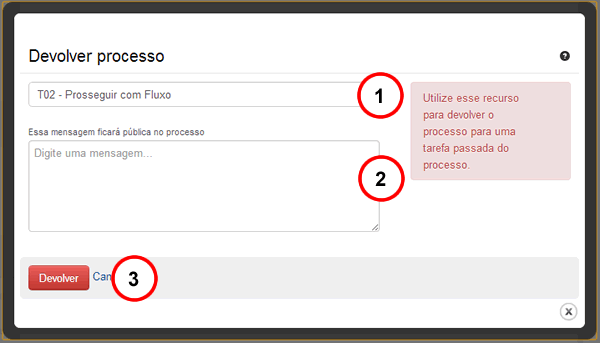 Devolver processo significa finalizar a atividade atual e retornar o processo para uma atividade passada já executada. Esse recurso pode ser utilizado quando um ator observa inconsistência no processo e não há mapeado, no fluxograma, uma regra padrão de devolução.