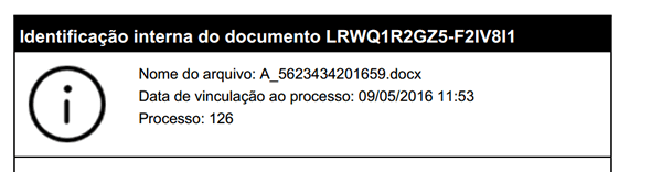 - Controle de segurança: de modo a garantir a confiabilidade dos documentos, notadamente se impressos, sempre que um documento for visualizado através do visualizador de documentos, em seu rodapé será plotado, automaticamente, um código de identificação, como na imagem abaixo: