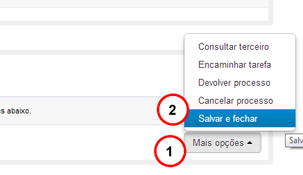 "Salvar e fechar" significa salvar todas as informações que você digitou nessa instância de processo, fechar a tela de execução da atividade, porém manter a atividade ativa e pendente com você.