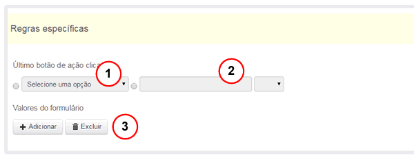 - Valores do Formulário: se a condição do vínculo deve estar ligada a um valor do formulário, clique no botão "Adicionar" dentro desta caixa. Uma nova linha de condição será inserida. Esta condição possuirá os seguintes campos: