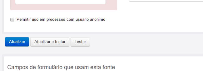 5. Permitir o uso em processos com usuário anônimo: essa é uma mudança importante do sistema da versão 3.6.2 para 3.6.3. Em versões mais antigas do sistema todas as fontes de dados podiam ser usadas, sem restrições, em processo anônimos, onde não temos um usuário identificado. Por questões de segurança, a partir da versão 3.6.3, essa opção vem desabilitada. Caso você queira usar essa fonte de dados em um ambiente não autenticado, deve marcar essa opção. Durante a migração do sistema da versão 3.6.2 para 3.6.3, todas as fontes de dados já existentes foram automaticamente marcadas para permitir o uso em processos anônimo, fixando o comportamento antigo e evitando problemas de compatibilidade.