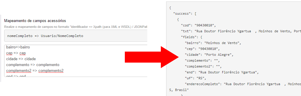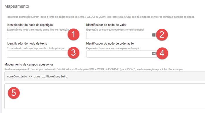 Tanto o XPath quanto o JSONPath são linguagens de navegação em documentos XML e JSON, respectivamente. O mapeamento é realizado no formulário de cadastro da fonte de dados: