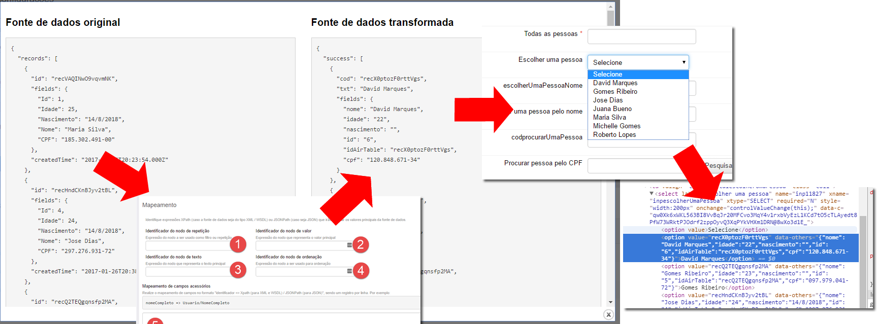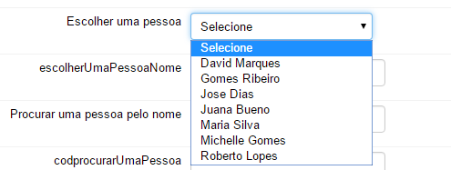 - Em campos do formulário do tipo "caixa de seleção", "sugestão" ou "pesquisar e preencher", caso os identificadores da fonte de dados transformada sejam iguais aos identificadores de outros campos do formulário. Nesse cenário, esses campos terão seus valores automaticamente preenchidos uma vez selecionado o valor principal do campo origem. Exemplo: digamos que você tenha uma fonte de dados de pessoas cujo atributo "id" é o identificador único da pessoa, e o atributo "txt" é o nome da pessoa. O vetor "fields" poderia ter uma série de atributos adicionais com outras informações da pessoa, como "email", "cpf" e "sobrenome". Se você vincular essa fonte de dados a um campo caixa de seleção, o usuário poderá ver e escolher um dos nomes de pessoas disponíveis. Quando o usuário escolher uma pessoa, caso existam campos nesse formulário com identificadores "email", "cpf" e "sobrenome", esses campos serão automaticamente preenchidos com as informações da fonte de dados transformada.
