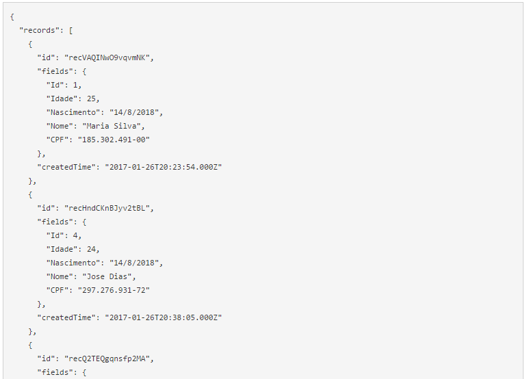Quando você executar uma conexão a uma API utilizando um dos padrões suportados, você terá como retorno um documento JSON, XML ou uma tabela de banco de dados (dependendo do tipo de fonte de dados).