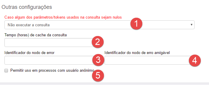 - Configuração de nulidade: Essa configuração somente é usada se a configuração da sua fonte de dados é dependente de variáveis de qualquer tipo, como informações do usuário logado, da instância de processo em execução ou mesmo dos valores de campos do formulário. Até a versão 3.6.2 do sistema, todas as fontes de dados existentes possuíam somente uma configuração de nulidade: "Substituir token por vazio e executar a consulta". A partir da versão 3.6.3, você pode escolher entre essa opção legada e uma nova opção padrão, "Não executar a consulta"