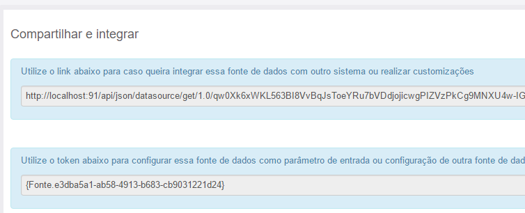 A caixa de "compartilhar e integrar" traz duas strings de integração dessa fonte de dados com outros sistemas.