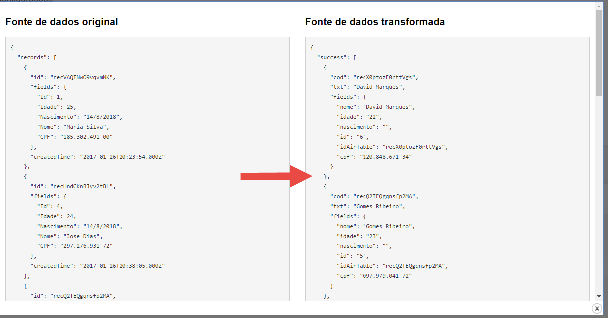 Veja o exemplo abaixo e compare o documento JSON retornado pela fonte de dados externa (a esquerda) e o documento transformado para o padrão Orquestra (a direita).