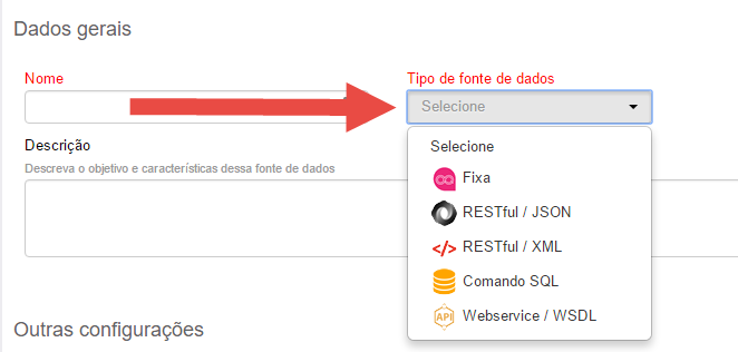 - Tipo de fonte de dados: refere-se a forma de integração com o outro sistema. A decisão sobre qual padrão de integração será usada é, geralmente, definida pela forma de integração suportada pelo seu sistema externo. Os demais campos do cadastro de fontes de dados irão depender da opção escolhida nesse momento;
