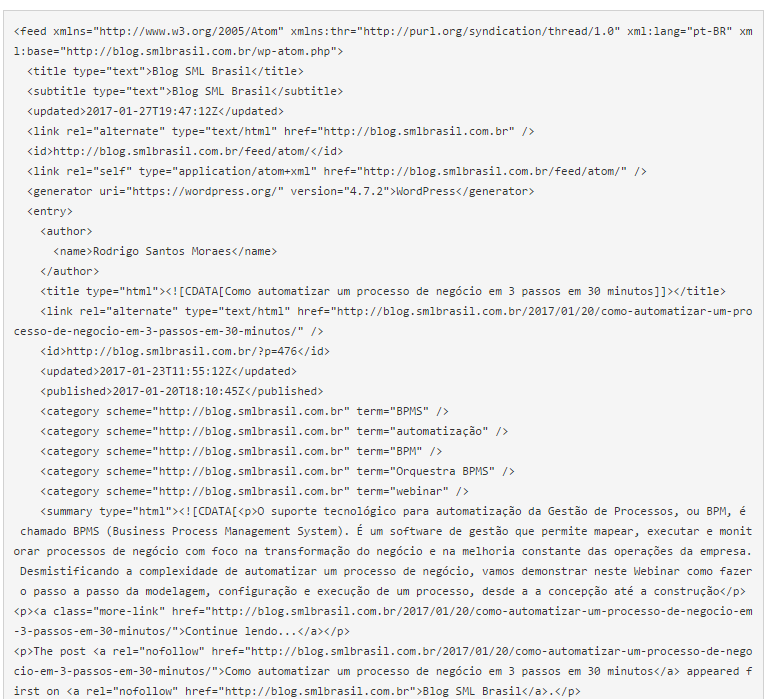 Observe que o identificador do nome de repetição pode ser a expressão XPath completa "//feed/entry" ou simplesmente o nome do nó de repetição, "entry". Isso pois, no caso exclusivo desse nodo, o Orquestra, caso não identifique a expressão de busca como XPath, irá simplesmente realizar uma busca simples pelo nome do nodo no documento.