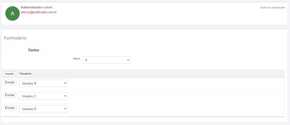 - Ativo: Fonte de dados que possui as opções de N e S para trazer os usuários ativos nas opções do campo Usuário;