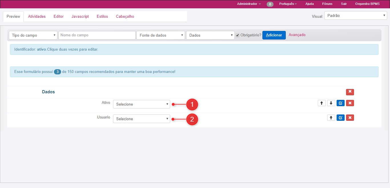 Obs: Quando uma fonte de dados do tipo SQL possui dependência do valor escolhido por outro campo do tipo fonte de dados para que o resultado desta seja retornado, é necessário que o campo que fornece o valor para o campo dependente esteja primeiro na ordem do formulário com visual padrão, para então possa ser configurado no tipo editor.