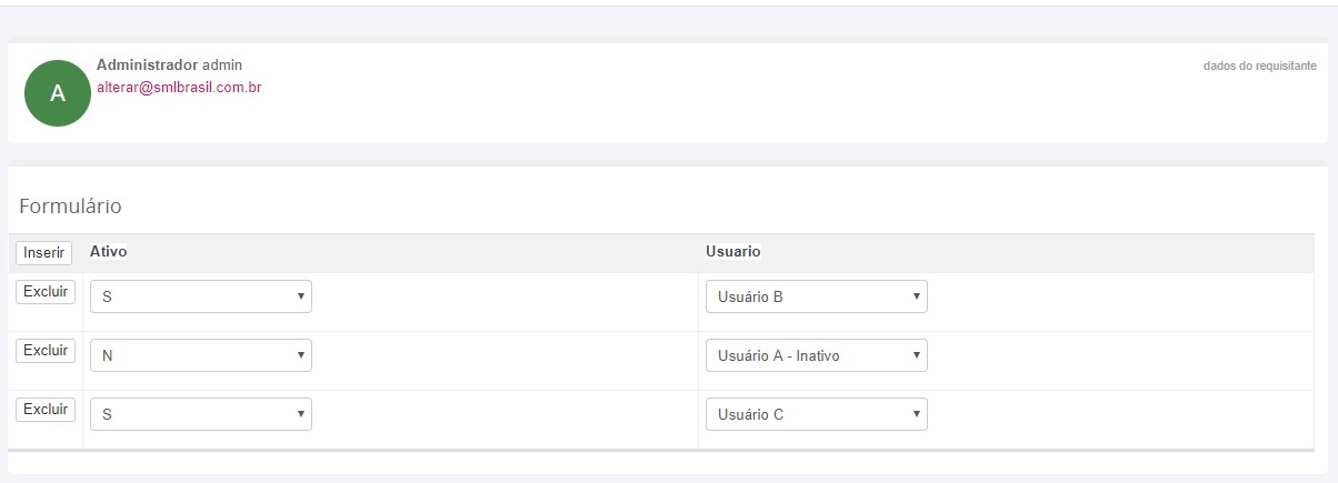 Quando utilizado a opção acima, não é possível selecionar opções diferentes com base na fonte de dados que fornece o parâmetro para o campo dependente, ou seja, como mostrado no exemplo, caso seja selecionado o valor "S" no campo "Ativo", apenas serão listados os usuários ativos para todas as opções do campo "Usuário" nas linhas da tabela multivalorada. Além disso, caso seja mudado o valor do campo "Ativo", todas as opções dos campos da tabela serão alterados. |