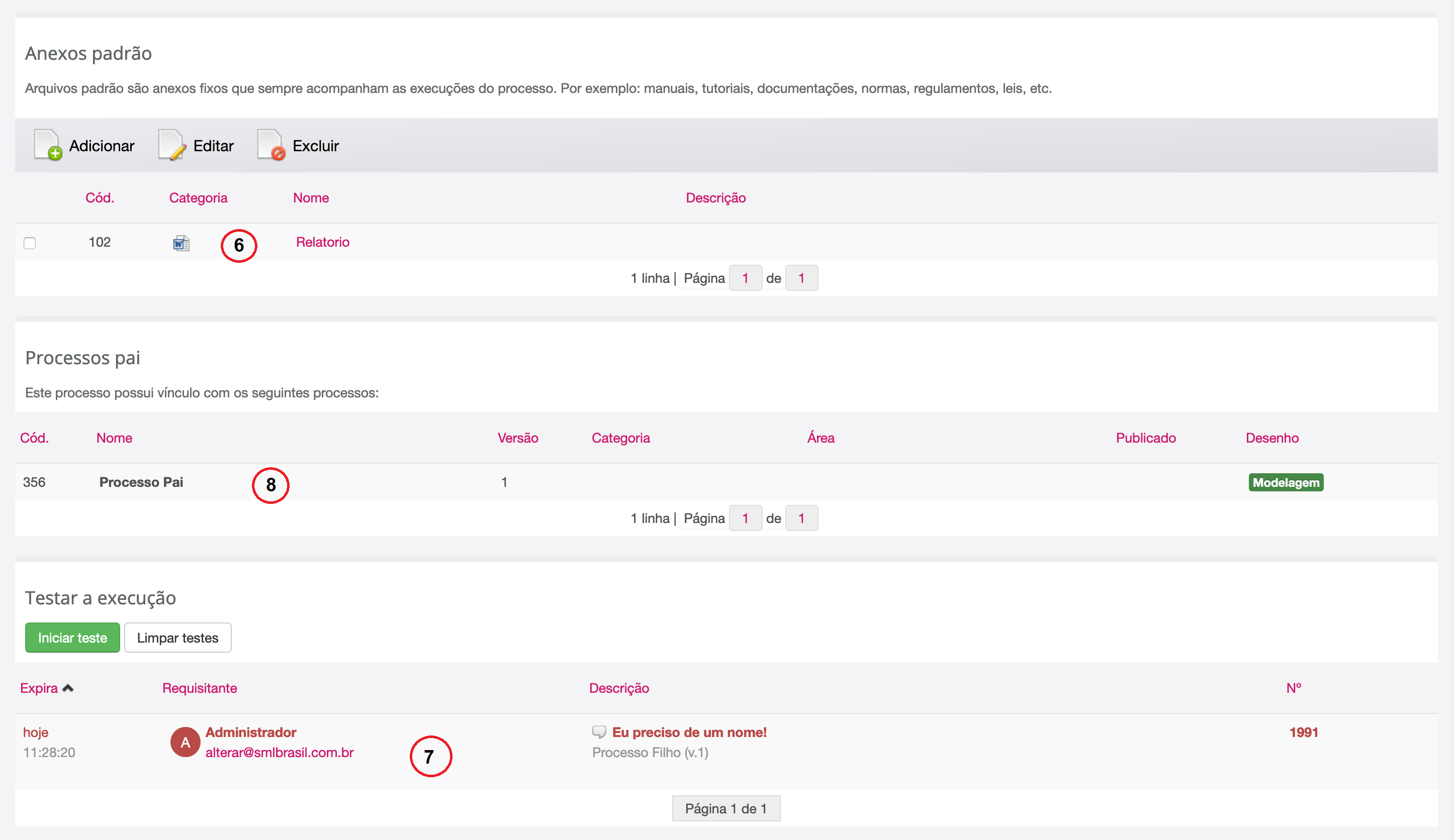 Para limpar os testes de execução dos processos basta clicar no link "Limpar testes"