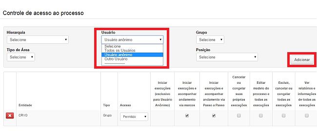 Cada processo precisará ser configurado para permitir o uso de acesso anônimo. A permissão é dada através da tela Gerenciar Acesso.