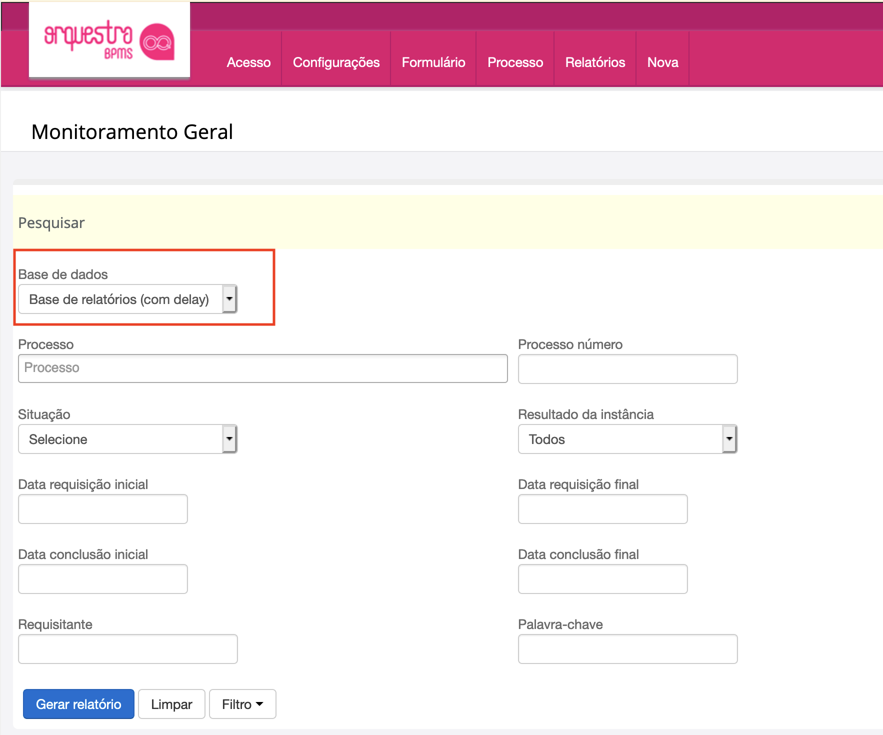 - Processo: selecione o processo que deseja realizar a pesquisa. Você somente tem acesso aos relatórios de processo que possui permissão explícita para isso, dada pelo criador do processo.