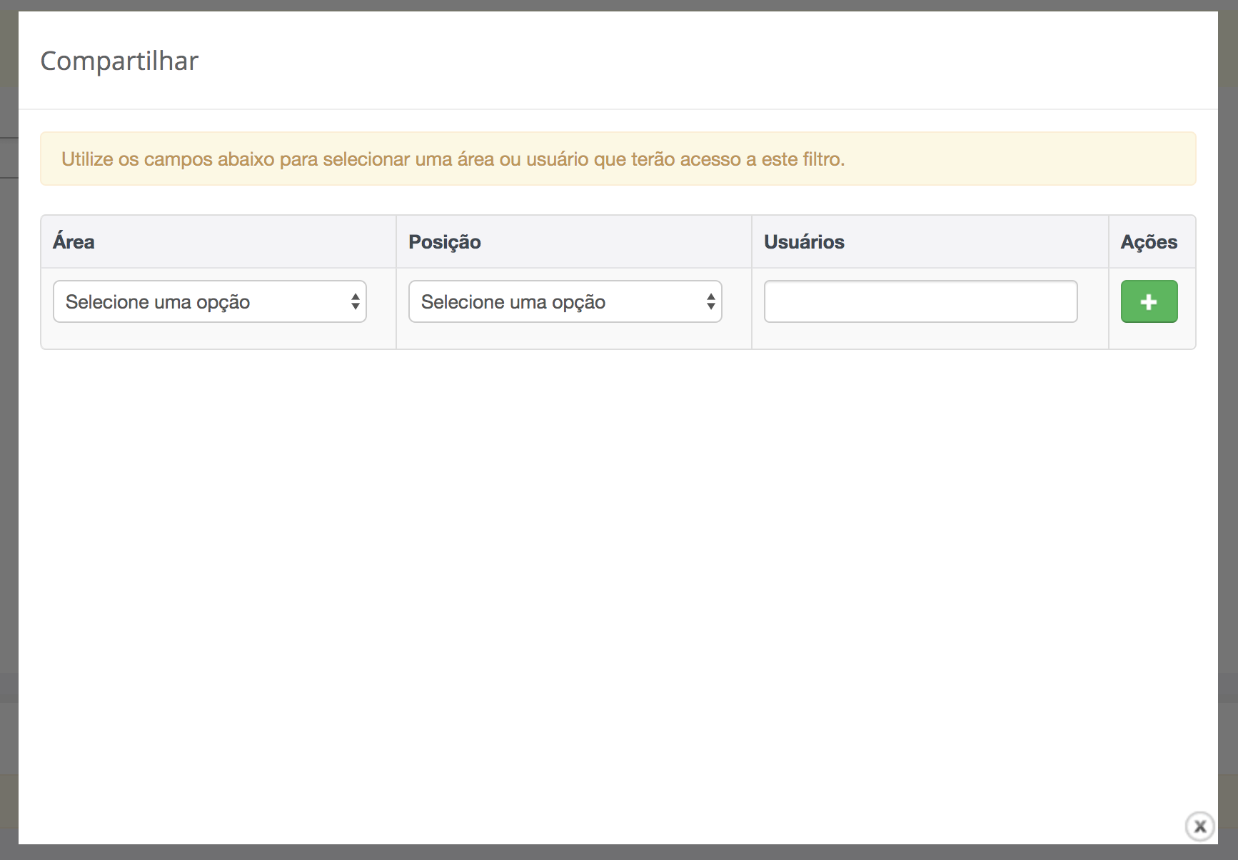 Para compartilhar esse filtro é possível definir quais usuários, quais posições e quais áreas poderão fazer uso deste filtro.