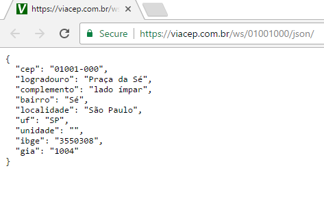 - Endereço de definição do serviço: cadastre aqui a URL do serviço REST que você irá conectar. Essa URL poderá possuir informações dinâmicas, como tokens. Por exemplo, considere a seguinte URL JSON que retorna uma consulta a CEP: