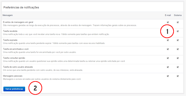 - O usuário deve apontar na tabela de preferências de notificações, para cada notificação, se deseja recebe-la por e-mail ou dentro do Orquestra, ou ambas. É obrigatório selecionar uma opção.