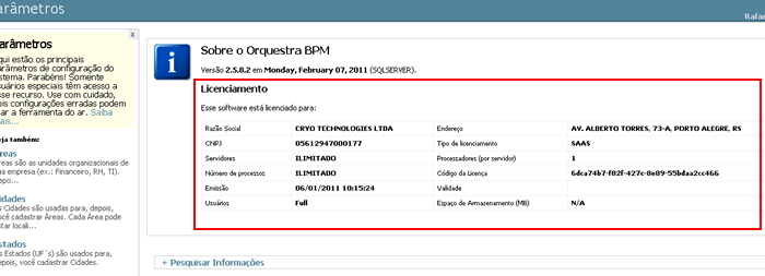 Para consultar sua licença de uso, acesse o módulo de CONFIGURAÇÕES -> PARÂMETROS dentro do seu Orquestra BPM. Informações completas sobre a licença estarão disponíveis: