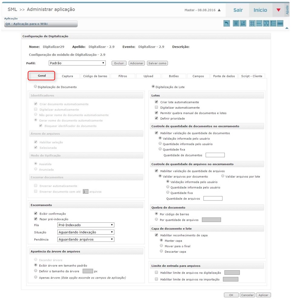 Na aba Geral é possível definir qual é o tipo de digitalização a ser realizada: documentos ou lotes. Dependendo do tipo de digitalização escolhida, é possível configurar validações de quantidade de arquivos, modo de tipificação, preenchimento de informações sobre o nome do lote/documento, reconhecimento de códigos de barras e capas, entre outros.