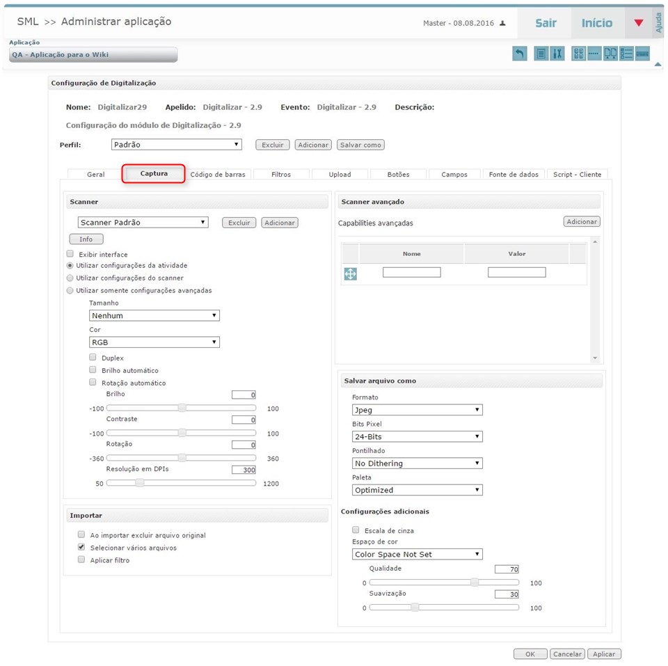 Na aba Captura é possível configurar a cor, formato de arquivo, quantidade de bits, contraste, entre outras configurações da digitalização. Também é possível aplicações configurações diferentes para cada scanner ou configurar snapshots:
