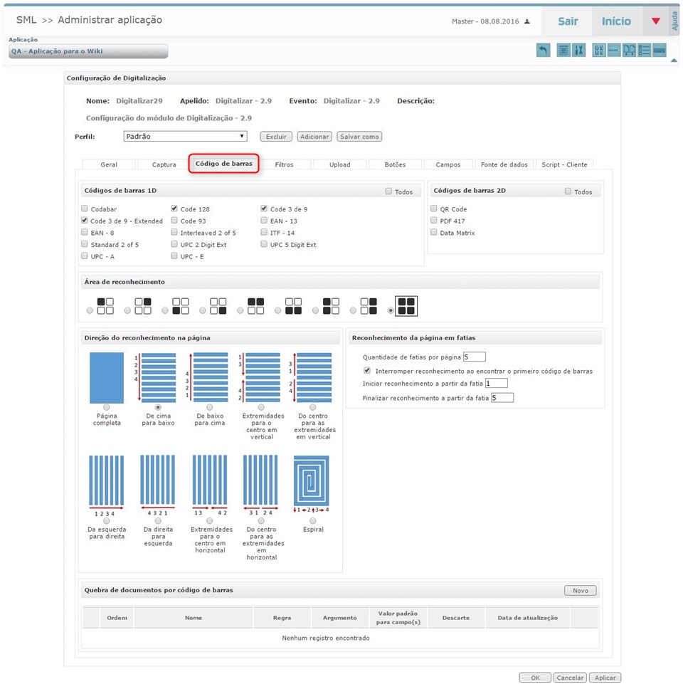 A aba Código de barras só está disponível quando configurada a digitalização de lotes. Nela, é possível configurar quais tipos de códigos de barras serão reconhecidos, em qual local da página e regras para reconhecimento ou descarte do lote quando determinado código de barras for identificado: