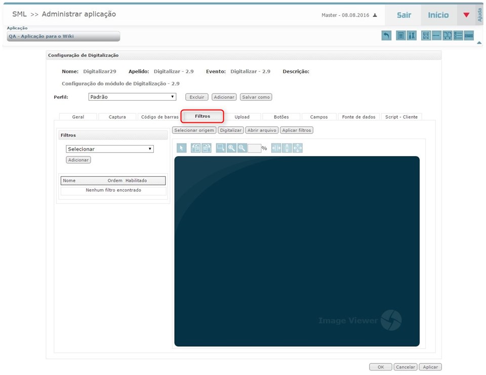 Na aba Filtros é possível configurar filtros que serão aplicados diretamente na imagem durante a digitalização: