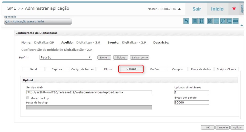 A aba Upload contém a configuração do webservice que fará o upload da imagem para o servidor: