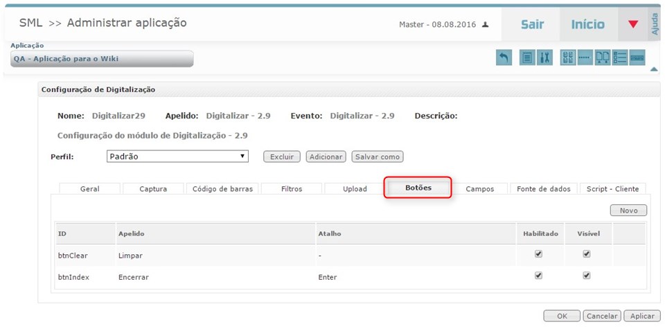 Na aba Botões é possível configurar os botões exibidos no módulo, assim como sua ação e teclas de atalho: